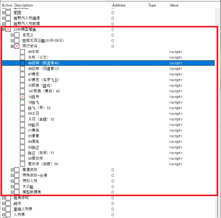 1項でDLした「35O替换主角_适用1.07版本.CT」では、見た目変更で使うチートは一番上の項目の中にまとまってます。この新CTではフリーズしないよう考慮されてるようなので、いつでも項目オンオフしたりキャラクターを変更しても大丈夫です。