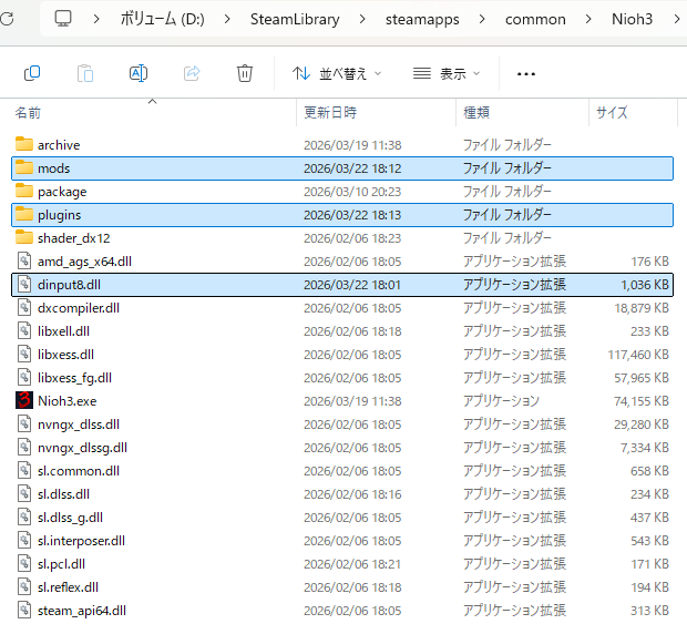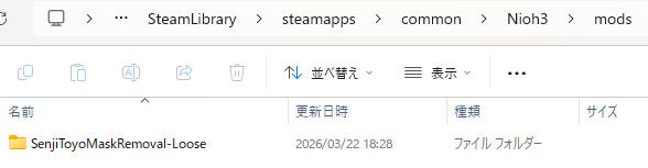 さらに仁王3のインストールフォルダに「mods」フォルダを手動で作ります。